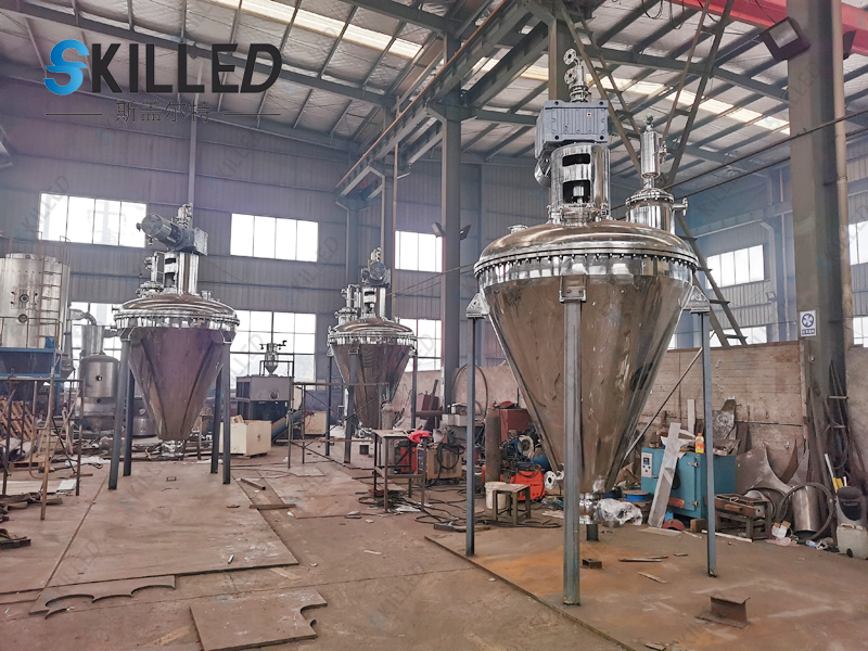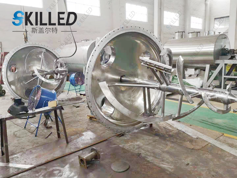 1、单锥真空干燥机工作过程为间歇批操作,湿物料进入料仓后,通过筒壁夹套和螺旋桨内部给热,使给热面积达到整个容器面积的140%,对物料进行升温干燥。并选择相应的锥型干燥混合器型号(工作容积)达到理想的干燥效果。采用上驱式结构的混合干燥机具有高效干燥、混合能力的同时,具有空间充裕,更便于使用者进行检修维护的特点。