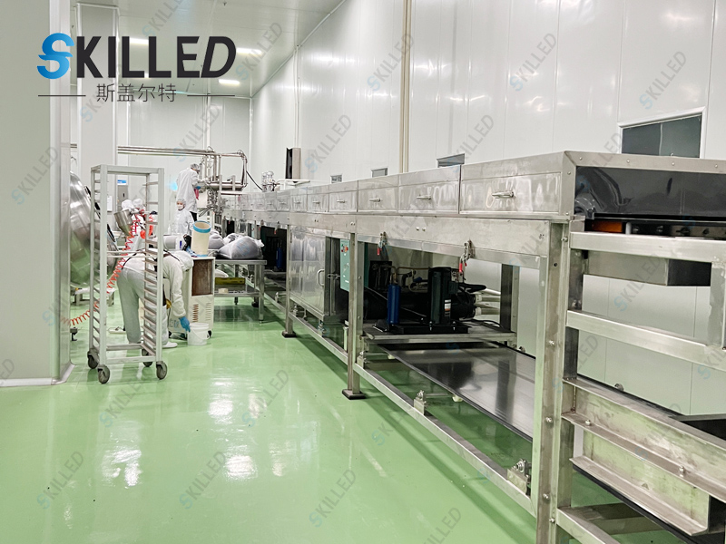 产品概述 巧克力造粒机是利用物料的熔点低于250℃的特性,根据物料熔融态时的粘度范围,通过特殊的布料装置将熔融液均匀在其下方匀速移动的钢带上,在钢带下方设置的连续喷淋装置的冷却作用下,使物料在输送、移运过程中得到冷却、固化、包装,从而达到造粒成型的目的。